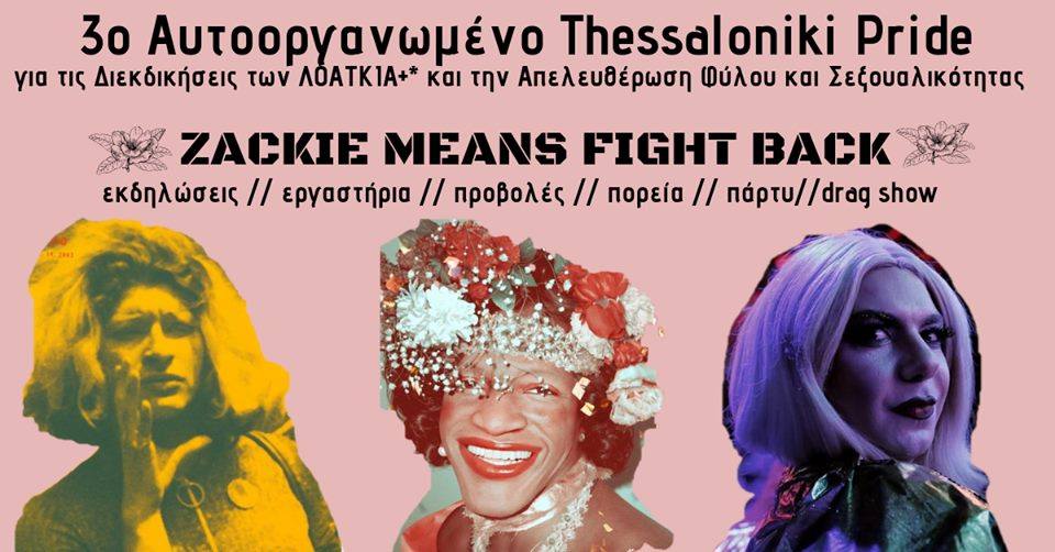 Με αυτό το σκεπτικό, το φετινό 3ο αυτο-οργανωμένο Thessaloniki Pride, το ριζοσπαστικό Pride «από τα κάτω και με τις, τ@ και τους κάτω», το Pride που στηρίζεται στη συντροφικότητα, την αλληλεγγύη και την ενότητα όλων των καταπιεσμένων μακριά από επιχορηγήσεις, εταιρείες και χρηματοδοτικά πακέτα, προσπαθεί να πατήσει πάνω στο αυλάκι που χάραξε το διεκδικητικό κίνημα του 1969. Πιστό στην παράδοση της εξέγερσης και συνεπές με τα αιτήματα του σήμερα, οργανώνει εβδομάδα εργαστηρίων και εκδηλώσεων. Και βγαίνει στους δρόμους. Βγαίνουμε στους δρόμους κουβαλώντας τον θυμό και τη θλίψη από τη δολοφονία του Ζακ/της Zackie Oh από νοικοκυραίους, φασίστες και αστυνομία. Και προσπαθούμε να μετασχηματίσουμε την πίκρα σε καύσιμη ύλη για τους αγώνες και τις διεκδικήσεις μας.