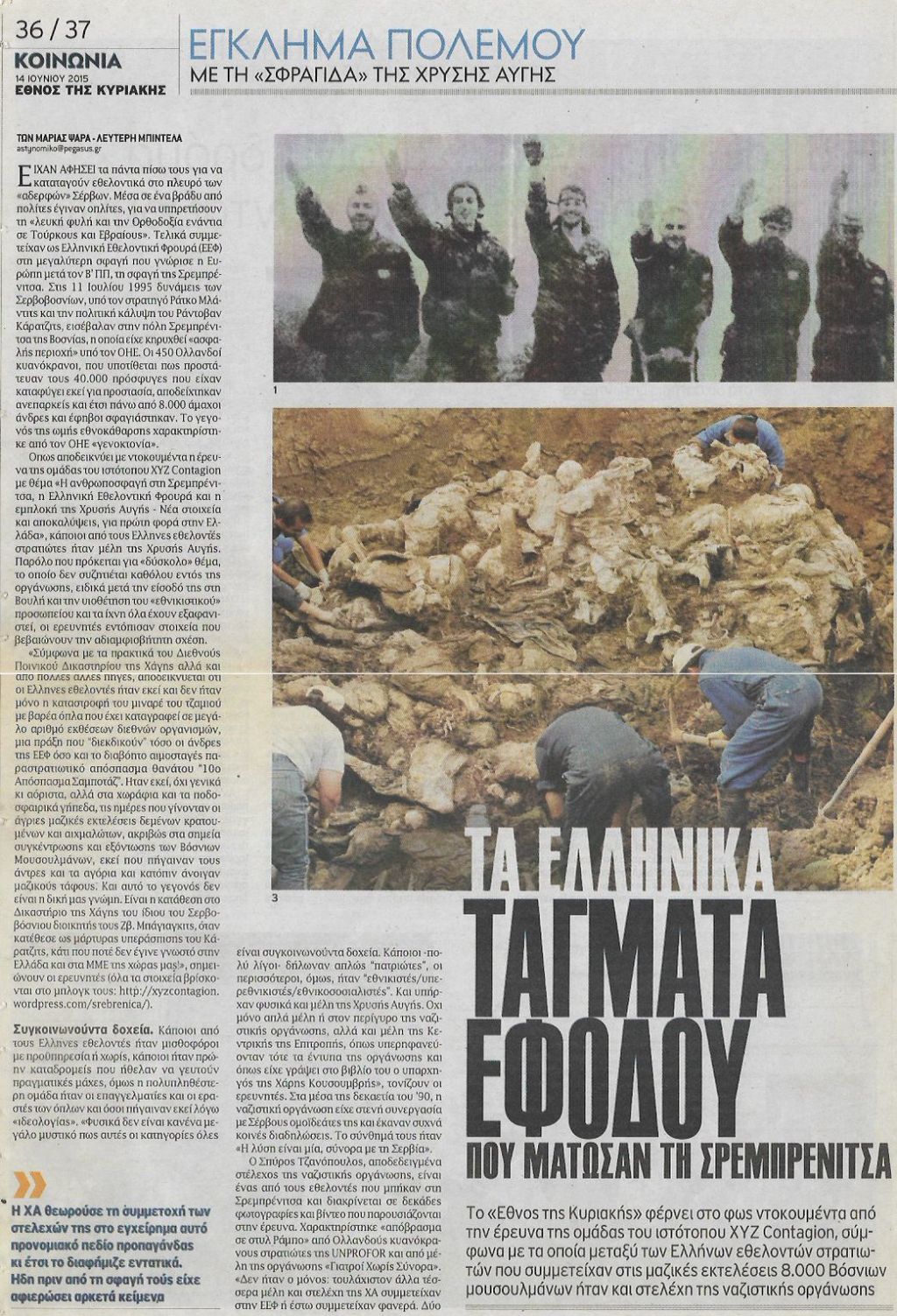 Όσο για τους 12 τουλάχιστον Έλληνες που πήραν μέρος στη σφαγή της Σρεμπρένιτσα (από τους 60-70 συνολικά χρυσαυγίτες του Σερβοβοσνιακού στρατού) διατάχτηκε από το 2006 εισαγγελική έρευνα από τον τότε Υπουργό κ. Παπαληγούρα κι έκτοτε αγνοείται η τύχη της.