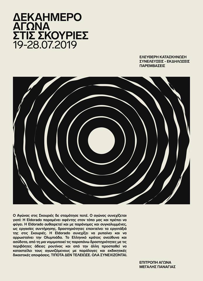 Από τις 19-28 Ιουλίου, η Επιτροπή Αγώνα κατά των εξορύξεων χρυσού της Eldorado καλεί σε ένα δεκαήμερο αγώνα με συνελεύσεις, εκδηλώσεις, μουσική και ελεύθερη κατασκήνωση στις Σκουριές.