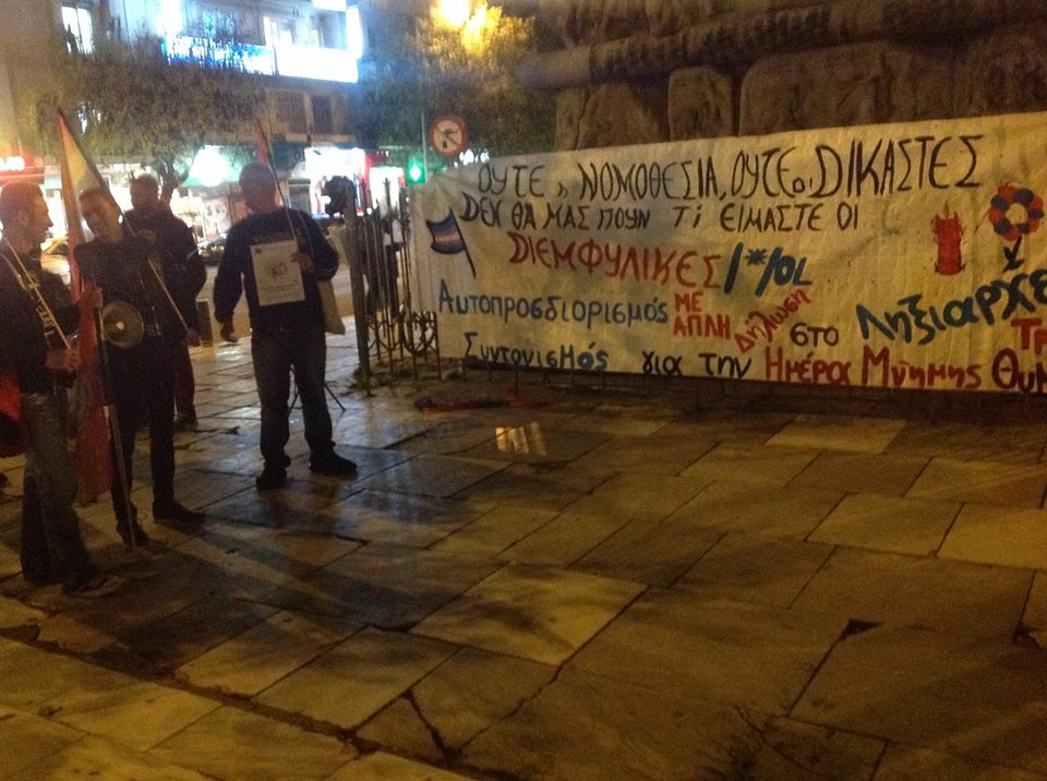 Από τη χτεσινή διαμαρτυρία στην Καμάρα, που διοργάνωσε ο Ανοιχτός Συντονισμός Θεσσαλονίκης για τη Διεθνή Ημέρα Μνήμης Τρανς Θυμάτων