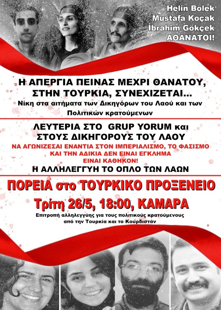 Στη μεγάλη αντίσταση της απεργίας πείνας μέχρι θανάτου, έπεσαν μάρτυρες 3 σύντροφοί μας. H Helin Bölek και ο İbrahim Gökçek , μέλη του επαναστατικού συγκροτήματος Grup Yorum, στη 288η και 323η μέρα αντίστοιχα και ο σύντροφος Mustafa Koçak στη 297η μέρα. Οι σύντροφοι δώσανε τη ζωή τους στον αγώνα για δικαιοσύνη και ελευθερία έκφρασης αντιστεκόμενοι στο φασιστικό καθεστώς του ΑΚΡ, στην καταπίεση και τη φίμωση που αυτό επιβάλλει στους αγωνιστές και τους λαούς της Τουρκίας. Παλέψανε με τρομερή δύναμη ψυχής και ανιδιοτέλεια για τα δίκαια αιτήματα του Grup Yorum και για το σύνολο των αιτημάτων της απεργίας πείνας. Δεν έσκυψαν ποτέ το κεφάλι και δε λύγισαν ούτε για μια στιγμή, αντιστάθηκαν στα βασανιστήρια, στην άγρια καταστολή και στις φυλακίσεις. Αγωνίστηκαν για τους εργαζόμενους, τους νεολαίους και τους λαούς της Τουρκίας, με πίστη και αυταπάρνηση. Γι’ αυτό και το καθεστώς Ερντογάν, φοβάται τη δύναμη αυτού του αγώνα και δε δίστασε να επιτεθεί ακόμα και στις κηδείες των μαρτύρων μας, με δακρυγόνα συλλήψεις και βασανιστήρια. Στην πολιτική κηδεία του συντρόφου İbrahim Gökçek, φτάσανε σε σημείο να απαγάγουν το σώμα του, εξαπολύοντας μεγάλη αστυνομική επίθεση, προσαγάγοντας μέχρι και τον πατέρα του.