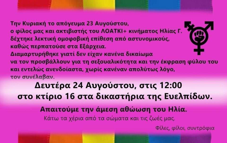 Την Κυριακή το απόγευμα 23 Αυγούστου, ο φίλος μας και ακτιβιστής του ΛΟΑΤΚΙΑ+ κινήματος Ηλίας Γ. δέχτηκε λεκτική ΛΟΑΤΚΙΑ+φοβική επίθεση από αστυνομικούς, καθώς περπατούσε στα Εξάρχεια. Διαμαρτυρήθηκε γιατί δεν είχαν κανένα δικαίωμα να τον προσβάλλουν για τη σεξουαλικότητα και την έκφραση φύλου του και εντελώς ανενδοίαστα, χωρίς κανέναν απολύτως λόγο, τον συνέλαβαν. Τον οδήγησαν στο Αστυνομικό Τμήμα Εξαρχείων, όπου του απέδωσαν κατηγορίες για απειλή και εξύβριση. Πρόκειται για χυδαία ψεύδη και στημένο κατηγορητήριο, που μόνο στόχο έχει να ταλαιπωρήσει έναν άνθρωπο και να τον τιμωρήσει, επειδή δε σιώπησε.