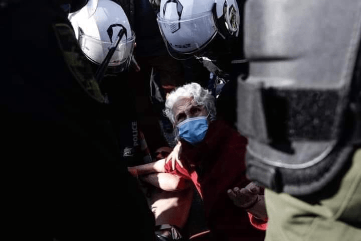 Στη φωτογραφία μια καθηγήτρια του Α.Π.Θ. (η κ. Κωνσταντίνα Ριτσάτου από το Τμήμα Θεάτρου) προστατεύει με το σώμα της τον πεσμένο και χτυπημένο φοιτητή από τη κτηνώδη επίθεση των ανδρών των ΜΑΤ.