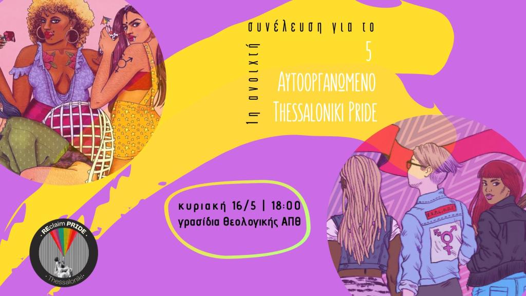 Την Κυριακή 16/5 στις 18:00 στα Γρασίδια Θεολογικής ΑΠΘ θα γίνει η 1η ανοιχτή συνέλευση της χρονιάς για τη διοργάνωση του 5ου Αυτοοργανωμένου Thessaloniki Pride! Για άλλη μια χρονιά σάς καλούμε να φτιάξουμε όλες, όλα και όλοι μαζί ένα Pride που θα ανταποκρίνεται στις πραγματικές ανησυχίες της λοατκια+ κοινότητας.