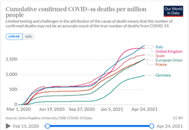 Αυτή η περιοδολόγηση θα ήταν σχεδόν αδιάφορη εάν δεν παρατηρούσαμε στα στατιστικά στοιχεία πολύ μεγάλες διαφορές μεταξύ του πρώτου και του δευτέρου κύματος: Όπως φαίνεται στο διάγραμμα 1, όπου εμφανίζονται τα στοιχεία, ενδεικτικά, της Ευρωπαϊκής Ένωσης και πέντε μεγάλων ευρωπαϊκών χωρών, ο αριθμός των νεκρών του Covid-19 ανά εκατομμύριο πληθυσμού στη διάρκεια του δευτέρου κύματος ήταν κατά προσέγγιση τετραπλάσιος από το πρώτο κύμα. Αυτό αποτελεί όμως ένα παράδοξο, διότι η πείρα και οι γνώσεις που είχαν αποκτηθεί στη διάρκεια του πρώτου κύματος θα έπρεπε να είχαν καταστήσει τον αγώνα κατά της επιδημίας αποτελεσματικότερο και το δεύτερο κύμα μικρότερης έντασης και διάρκειας. Αντί για αυτό, το δεύτερο κύμα συγκρινόμενο με το πρώτο εμφανίζεται ως καταστροφή.