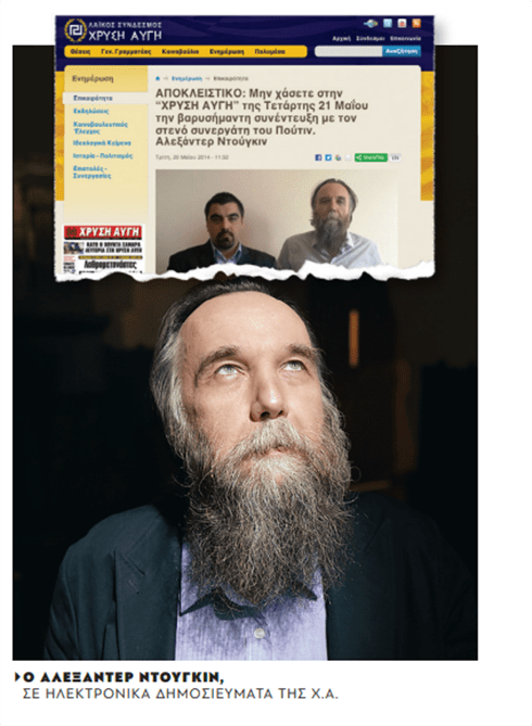 Όσον αφορά τους δεσμούς του Ντούγκιν με τους νεοναζί να αναφέρουμε, για την ιστορία, ότι το 2013 είχε στείλει επιστολή στον Μιχαλιάκο, όπου εξήρε το ρόλο των «φυλακισμένων αγωνιστών» της Χρυσής Αυγής. Η επιστολή είχε παρουσιαστεί με διθυράμβους στο σάιτ της Χρυσής Αυγής Λαμίας: «Μια επιστολή του Ρώσου καθηγητή και συγγραφέα Αλεξάντερ Ντούγκιν, ενός από τους πλέον στενούς συμβούλους και “κατηχητές” του Ρώσου προέδρου Πούτιν στην έννοια του “Ευρασιατισμού” έφτασε στον φυλακισμένο γ.γ. του Λαϊκού Συνδέσμου-Χρυσή Αυγή, Νίκο Μιχαλολιάκο πριν μερικές ημέρες».