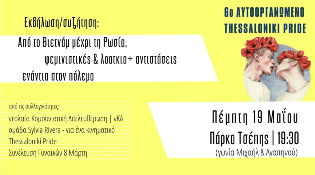 Αντιπολεμικό, φεμινιστικό και ΛΟΑΤ κίνημα –ήδη από τη μακρινή δεκαετία του ’60 στις ΗΠΑ, το Ισραήλ και τη Σερβία αργότερα βάδισαν μαζί και αλληλοτροφοδοτήθηκαν με συνθήματα, ιδέες και και τρόπους αντίστασης. Σε μία συγκυρία όπου ο πόλεμος διεξάγεται στην ίδια μας τη γειτονιά, και με την εμπλοκή της ίδιας μας της χώρας, δεν θα μπορούσαμε να μην έχουμε μια εκδήλωση αφιερωμένη στο πώς ο μιλιταρισμός περιορίζει τα δικαιώματα, στο πώς αντιστάθηκαν τα αδέλφια μας, και πως πρέπει να συνεχίσουμε εμείς τώρα. Από τον πόλεμο του Βιετνάμ μέχρι την Ουκρανία και την αντίσταση των Ρωσίδων φεμινιστριών στην καρδιά της ρωσικής αρκούδας εμπνεόμαστε από αυτούς τους αγώνες και φωνάζουμε ένα τεράστιο και ηχηρό «ΟΧΙ ΣΤΟΝ ΠΟΛΕΜΟ» και σε κάθε πτυχή του μιλιταρισμού.