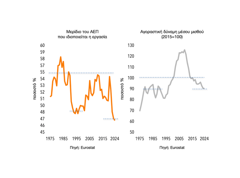 Η μείωση αυτή αντανακλάται και στο μερίδιο του προϊόντος (ΑΕΠ) που ιδιοποιείται ο κόσμος της εργασίας ως εισόδημα: ενώ το 2011 ανερχόταν σε 54,9% του ΑΕΠ, θα ανέλθει σε 47,4% το 2023 (πρόβλεψη Ευρωπαϊκής Επιτροπής). Η διαφορά είναι 7,5% του ΑΕΠ και αντιστοιχεί σε αγοραστική δύναμη περίπου 15 δισεκατομμυρίων ευρώ που χάνεται για τις εργαζόμενες τάξεις, όχι εφάπαξ αλλά ετησίως. Η Ευρωπαϊκή Επιτροπή, μάλιστα, προβλέπει ότι το μερίδιο της εργασίας στο προϊόν θα μειωθεί περαιτέρω κατά το 2024 σε 47,0%. Τότε πια, μόνο η Ουγγαρία, η Πολωνία και η Ρουμανία μεταξύ των 27 χωρών της Ευρωπαϊκής Ένωσης θα παρουσιάζουν μερίδιο εργασίας μικρότερο από την Ελλάδα.