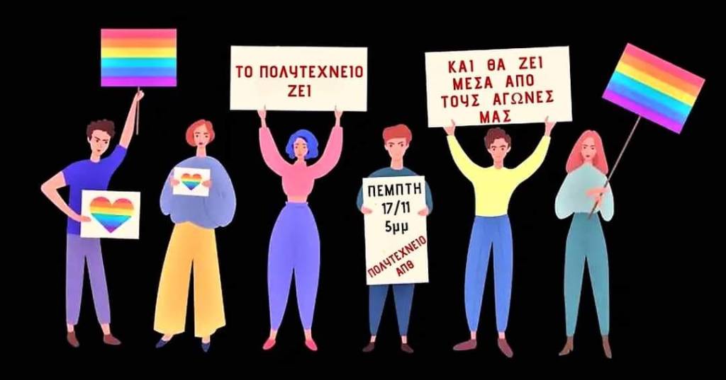 Απέναντι στη διαχρονική προσπάθεια του κυβερνητικού κέντρου και ευρύτερα του συστήματος να ανατραπούν όλες οι κατακτήσεις του Πολυτεχνείου και της Μεταπολίτευσης, εμείς τις υπερασπιζόμαστε με όλες μας τις δυνάμεις. Γιατί ξέρουμε πολύ καλά πως στο κλίμα ελευθερίας και αγώνων της μεταπολίτευσης είχαμε την ευκαιρία να αναπτυχθούμε περισσότερο ως λοατκια+ κίνημα και να φτάσουμε σήμερα να διεκδικούμε όλο και πιο πολλά δικαιώματα, με στόχο την ισότητα!