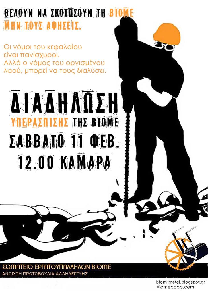 Επιβάλλεται να μην περάσουν τα σχέδια των κερδοσκόπων και της κυβέρνησης που τους ανοίγει τον δρόμο και την όρεξη για απίθανα κέρδη. Ο αγώνας των εργαζομένων της ΒΙΟΜΕ είναι ταυτόχρονα αγώνας ολόκληρου του κινήματος. Ήδη στη σημερινή ανοιχτή συνέλευση αλληλεγγύης κατατέθηκε πληθώρα προτάσεων και αποφασίστηκε να προχωρήσουμε σε σειρά δράσεων. Μια παγκόσμια καμπάνια συμπαράστασης σε ένα συγκινητικό και πρωτότυπο εγχείρημα αυτοδιαχείρισης, κύτταρο αντίστασης και υπόδειγμα για την εργατική τάξη.