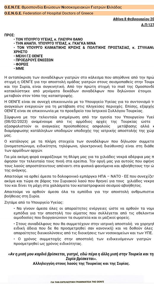 Η ΟΕΝΓΕ είναι σε συνεχή επικοινωνία με το Υπουργείο Υγείας για το συντονισμό των αναγκαίων ενεργειών για τη μετάβαση στις πληγείσες περιοχές. Επίσης, εξαρχής η ΟΕΝΓΕ είναι σε επικοινωνία με το προεδρείο του Ιατρικού Συλλόγου Τουρκίας.