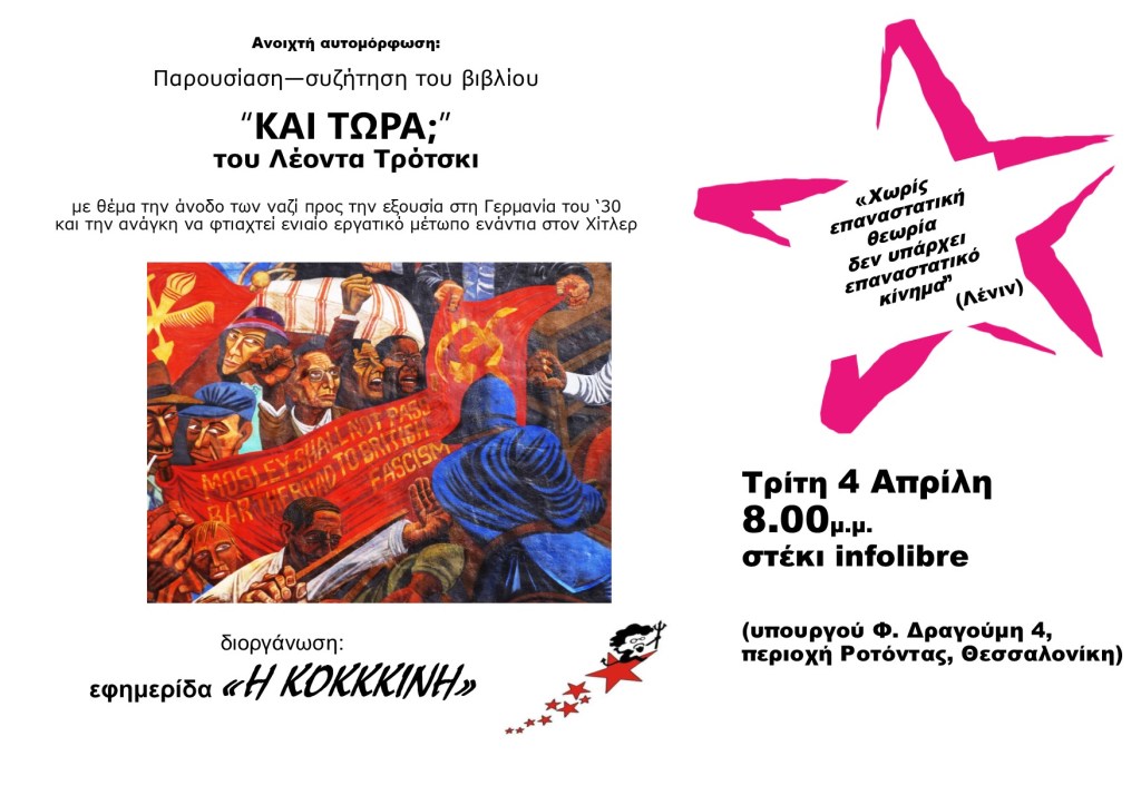 Ανοιχτή αυτομόρφωση της εφημερίδας “Η ΚΟΚΚΙΝΗ” για μια πρώτη γνωριμία με το έργο του Λέοντα Τρότσκι την Τρίτη 4 Απρίλη 2023 στις 8μμ, στο στέκι infolibre (υπουργού Φ. Δραγούμη 4, περιοχή Ροτόντας, Θεσσαλονίκη).