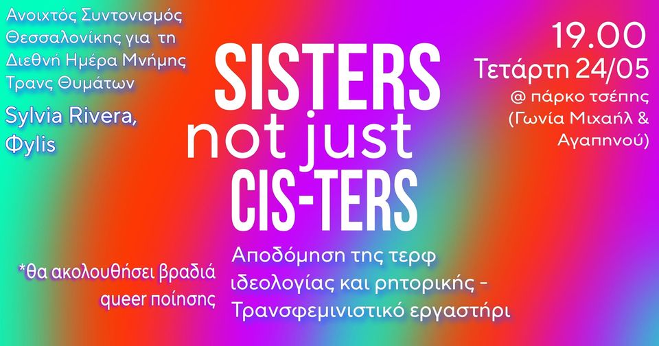 Το τρανσφεμινιστικό εργαστήρι αποδόμησης της τερφ ιδεολογίας και ρητορικής του Ανοιχτού Συντονισμού Θεσσαλονίκης για την Διεθνή Ημέρα Μνήμης Τρανς Θυμάτων, θα είναι διαδραστικό και ανοιχτό για όλα. Αρχικά, θα γίνουν δύο εισηγήσεις και στη συνέχεια θα ακολουθήσει συζήτηση κατά τη διάρκεια της οποίας θα τοποθετηθούν όσα από τα παρόντα άτομα θέλουν να συμβάλουν στην κουβέντα. Τυχόν ερωτήσεις μπορούν να απαντηθούν από οποιοδήποτε συμμετέχον άτομο ή/και απο τις εισηγήτριες.