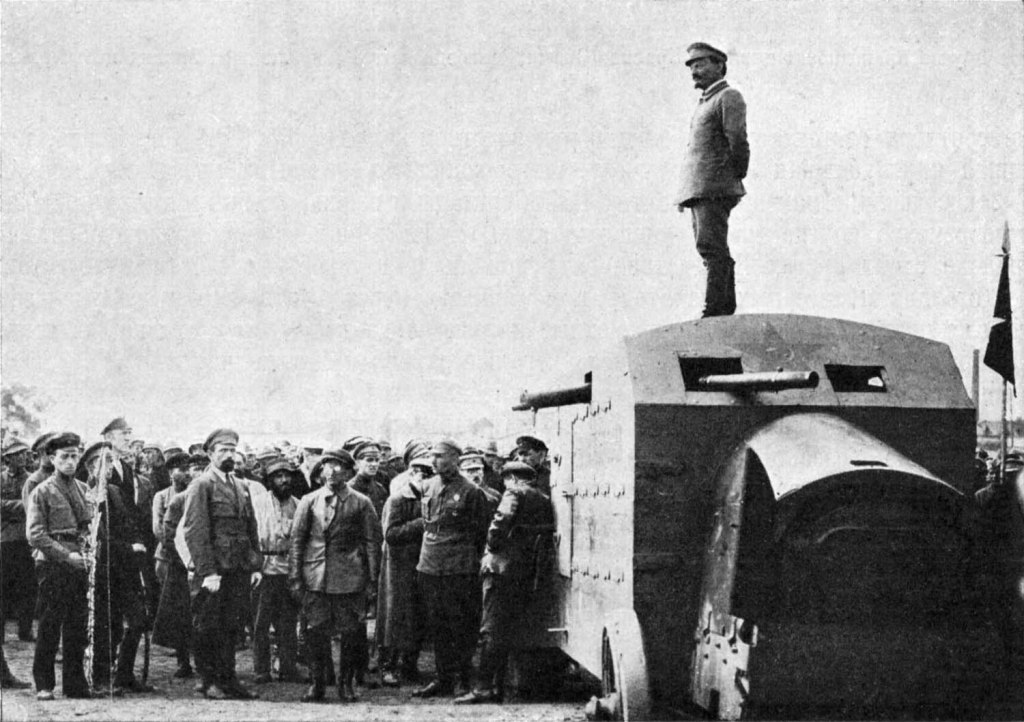 Ακόμη και σήμερα, δεν έχουμε καλύτερο δημοσιογράφο στη Ρωσία. Έχει μια ανεξάντλητη ευγλωττία και μια φωνή που δεν μπορεί να πνιγεί. Κοιτάξτε, από τις οκτώ το πρωί μέχρι τις οκτώ το βράδυ σήμερα, χωρίς να σταματήσει να ακούει, φωνάζει το όνομα κάθε οργάνωσης που περνάει. Ακούσατε πώς φωνάζει. Υπάρχουν τουλάχιστον είκοσι ή τριάντα χιλιάδες οργανώσεις στη Μόσχα, και νομίζω ότι είναι μεγάλη δουλειά να τις χαιρετάς όλες. Ο Τρότσκι είναι ο δεύτερος μεγάλος ηγέτης της επανάστασης μετά τον Λένιν. Ο Τρότσκι δεν ήταν μπολσεβίκος πριν. Όταν ξεκίνησε η επανάσταση, εντάχθηκε στο κόμμα.