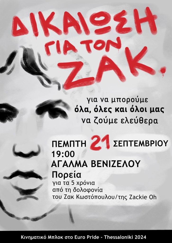 Στις 21 Σεπτέμβρη συμπληρώνονται 5 χρόνια από το άγριο λιντσάρισμα και τη δολοφονία του/της Ζακ Κωστόπουλου/Zackie Oh. 5 χρόνια μετά και όλοι οι δολοφόνοι του κυκλοφορούν ελεύθεροι. Οι 4 από τους αστυνομικούς που συμμετείχαν στον ξυλοδαρμό του Ζακ και οδηγήθηκαν σε δίκη κρίθηκαν αθώοι. Ενώ οι “πρωταγωνιστές” του λιντσαρίσματος, ο κοσμηματοπώλης Σπυρίδων Δημόπουλος και ο μεσίτης Αθανάσιος Χορταριάς κρίθηκαν ένοχοι για την κατηγορία της θανατηφόρας σωματικής βλάβης και καταδικάστηκαν σε 10 χρόνια φυλακή ο καθένας αλλά ο Δημόπουλος αποφασίστηκε να εκτίσει την ποινή του κατ’ οίκον και ο Χορταριάς αποφυλακίστηκε δύο μήνες μετά την καταδίκη του, αφού το δικαστήριο έκανε δεκτή την αίτηση αναστολής του.