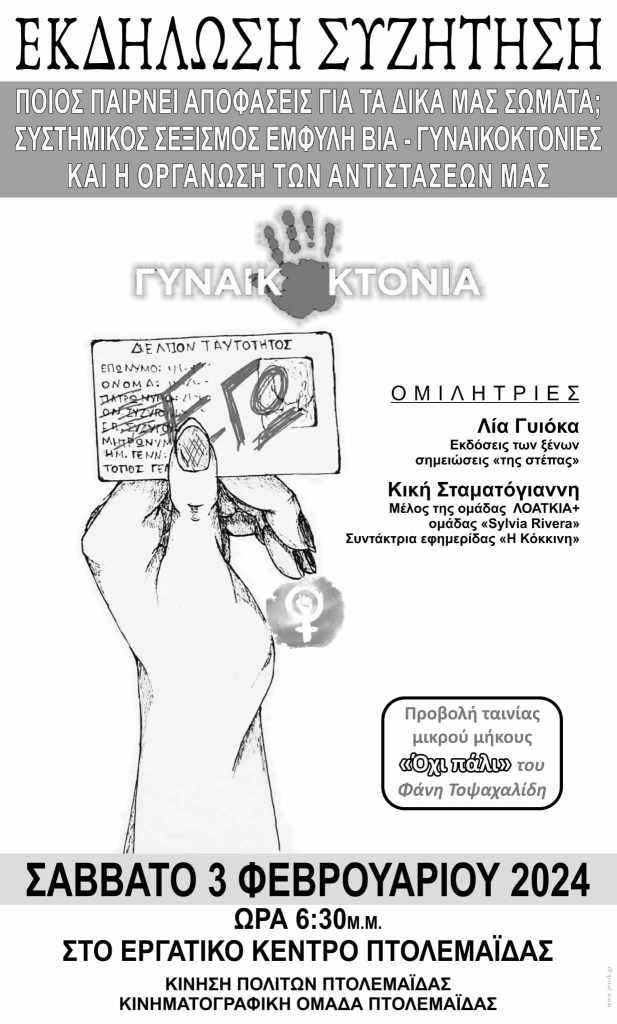 Το Σάββατο στις 3 Φλεβάρη στις 6.30μμ στο Εργατικό Κέντρο Πτολεμαΐδας, διοργανώνεται μια σημαντική εκδήλωση από την Κίνηση Πολιτών Πτολεμαΐδας και την Κινηματογραφική Ομάδα Πτολεμαΐδας. Θέμα της η έμφυλη βία και οι γυναικοκτονίες και το πώς να οργανώσουμε τις κινηματικές αντιστάσεις μας απέναντί τους.