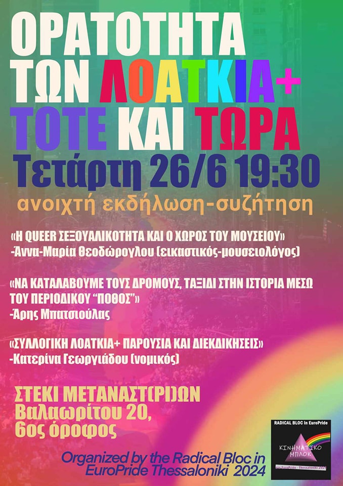 Do you wish for a flashback on the hidden queer secrets of the town, for a route to sexuality in relation to art, for an oral browse of the 90’s gay magazine «POTHOS» (Lust) and a tour to the lgbtqia+ reality of today? Then, save the date for Wednesday 26.06 at 19:30 at the Migrant’s Place of Thessaloniki, there will be an integrated lgbtqi+ discussion on all the issues that concern us. The speakers are: