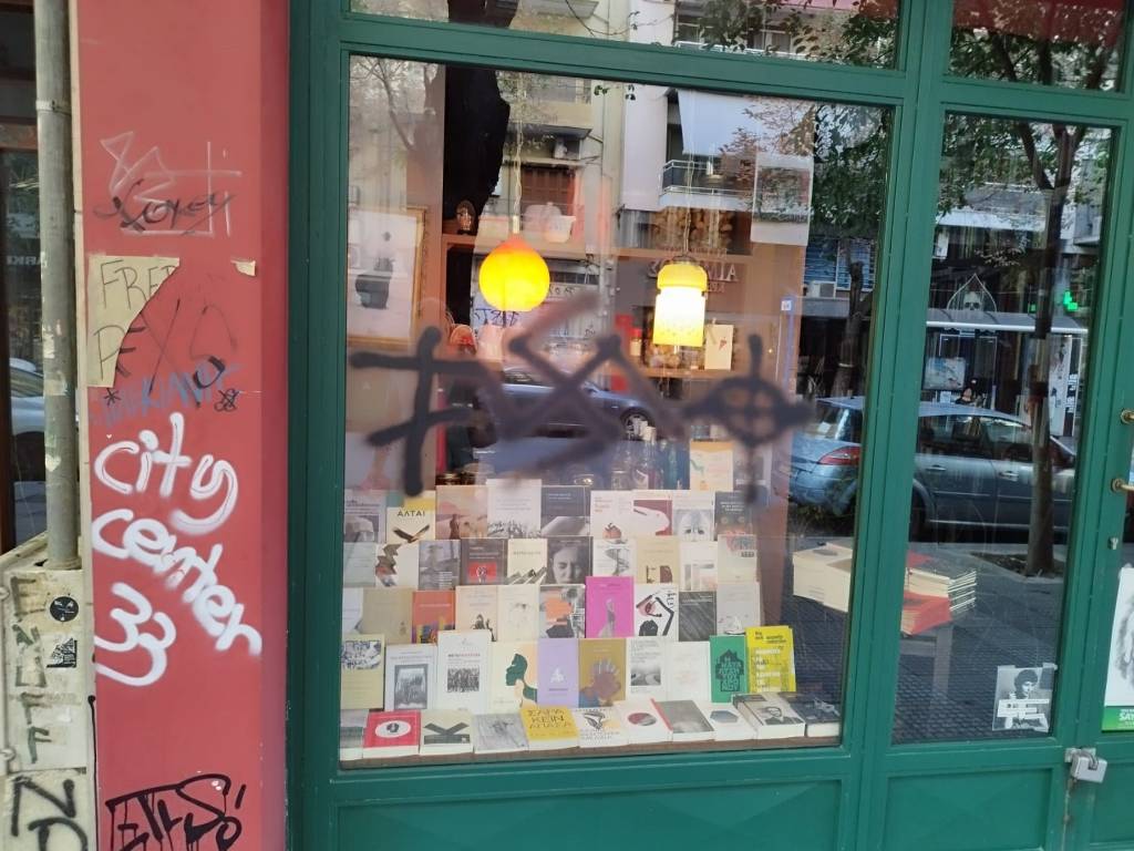 Σήμερα, είδαμε για άλλη μια φορά αυτό το δηλητήριο να στάζει στην βιτρίνα του βιβλιοπωλείου μας. Ενώ λοιπόν αυτό ήταν κλειστό, το βράδυ, σχεδίασαν στην πρόσοψη, σε μεγάλο σχήμα, έναν φασιστικό αγκυλωτό σταυρό, πλάι σε έναν κέλτικο σταυρό – στόχο, ο οποίος έγινε ευρέως γνωστός από την Κου-Kλουξ-Kλαν, χρησιμοποιήθηκε από τα τάγματα εφόδου της Χρυσής Αυγής αλλά και ως «σημάδι» σε σπίτια μεταναστών που επρόκειτο να δεχτούν επιθέσεις, και έναν χριστιανικό σταυρό. Δεν παρέλειψαν επίσης να σκίσουν και χαρτί από τον τοίχο με το σύνθημα «Freedom to Palestine».