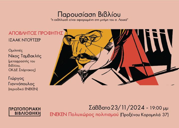 Μια πολύ σημαντική παρουσίαση βιβλίου θα γίνει το επόμενο Σάββατο 23 Νοέμβρη στη Θεσσαλονίκη. O «Απόβλητος Προφήτης» του Ισαάκ Ντόϋτσερ, ο τρίτος και τελευταίος τόμος της βιογραφίας του Λέοντα Τρότσκι, παρουσιάζεται πρώτη φορά στην πόλη.