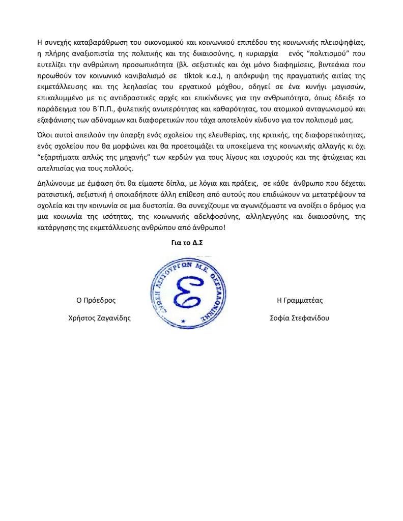 Δηλώνουμε με έμφαση ότι θα είμαστε δίπλα, με λόγια και πράξεις, σε κάθε άνθρωπο που δέχεται ρατσιστική, σεξιστική ή οποιαδήποτε άλλη επίθεση από αυτούς που επιδιώκουν να μετατρέψουν τα σχολεία και την κοινωνία σε μια δυστοπία. Θα συνεχίζουμε να αγωνιζόμαστε να ανοίξει ο δρόμος για μια κοινωνία της ισότητας, της κοινωνικής αδελφοσύνης, αλληλεγγύης και δικαιοσύνης, της κατάργησης της εκμετάλλευσης ανθρώπου από άνθρωπο!