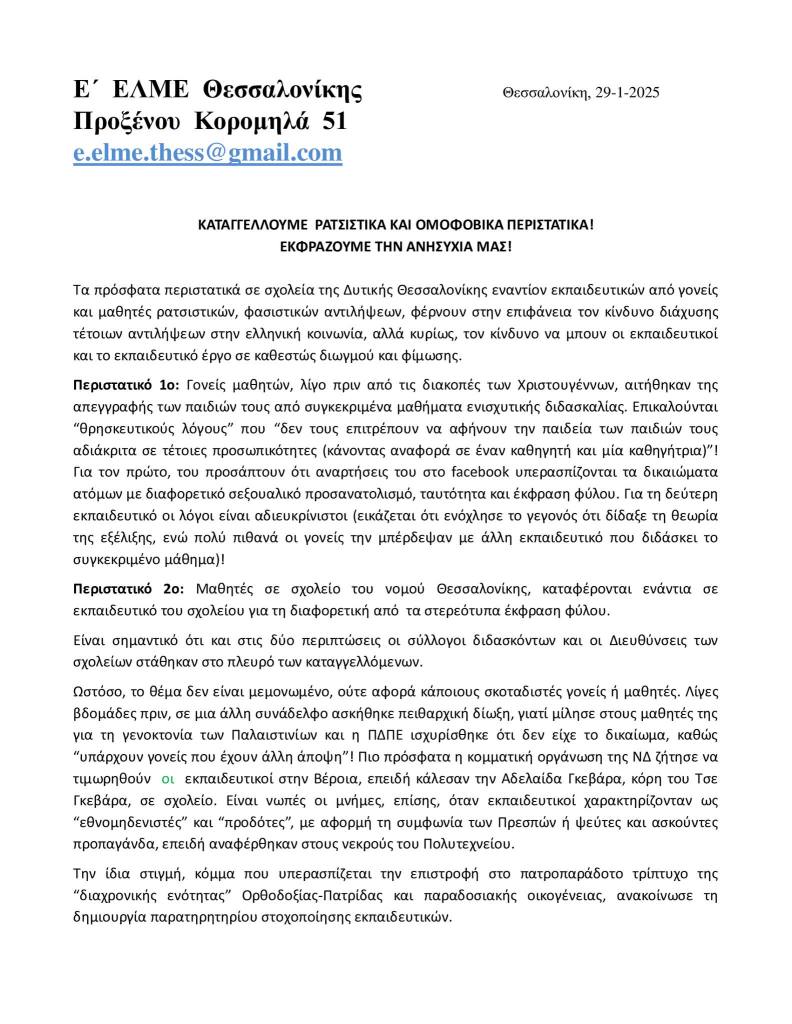 Τα πρόσφατα περιστατικά σε σχολεία της Δυτικής Θεσσαλονίκης εναντίον εκπαιδευτικών από γονείς και μαθητές ρατσιστικών, φασιστικών αντιλήψεων, φέρνουν στην επιφάνεια τον κίνδυνο διάχυσης τέτοιων αντιλήψεων στην ελληνική κοινωνία, αλλά κυρίως, τον κίνδυνο να μπουν οι εκπαιδευτικοί και το εκπαιδευτικό έργο σε καθεστώς διωγμού και φίμωσης.