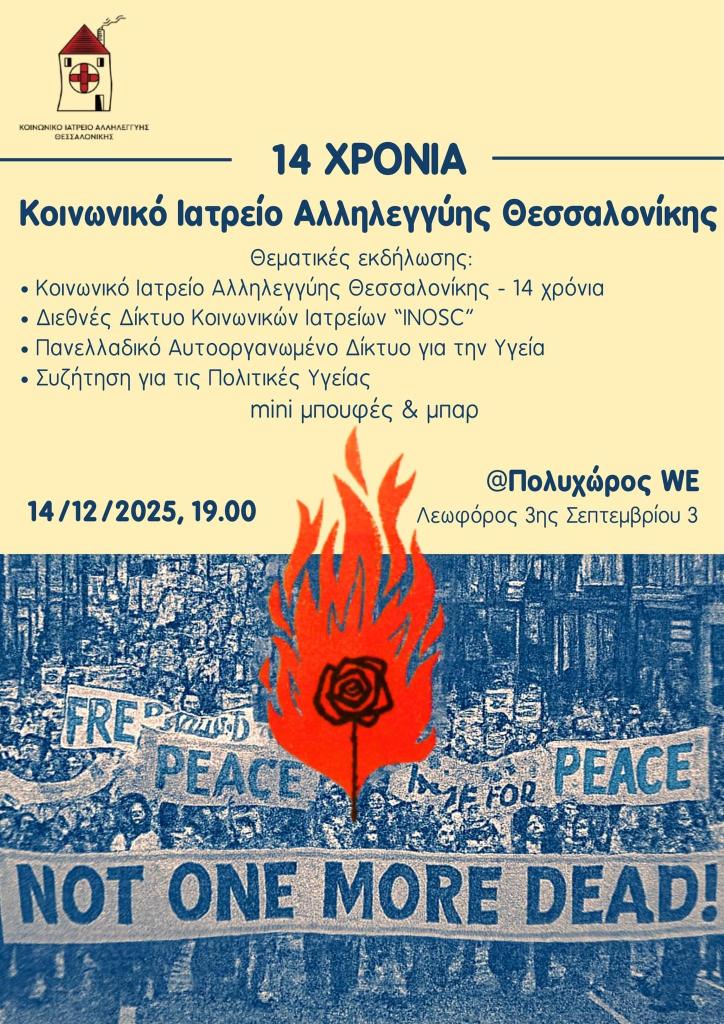 Ελάτε να γιορτάσουμε μαζί τα 14α γενέθλια του Κοινωνικού Ιατρείου Αλληλεγγύης Θεσσαλονίκης, την Κυριακή 14 Δεκεμβρίου, ώρα 7μμ, στον πολυχώρο WE (Λεωφόρος 3ης Σεπτεμβρίου 3).