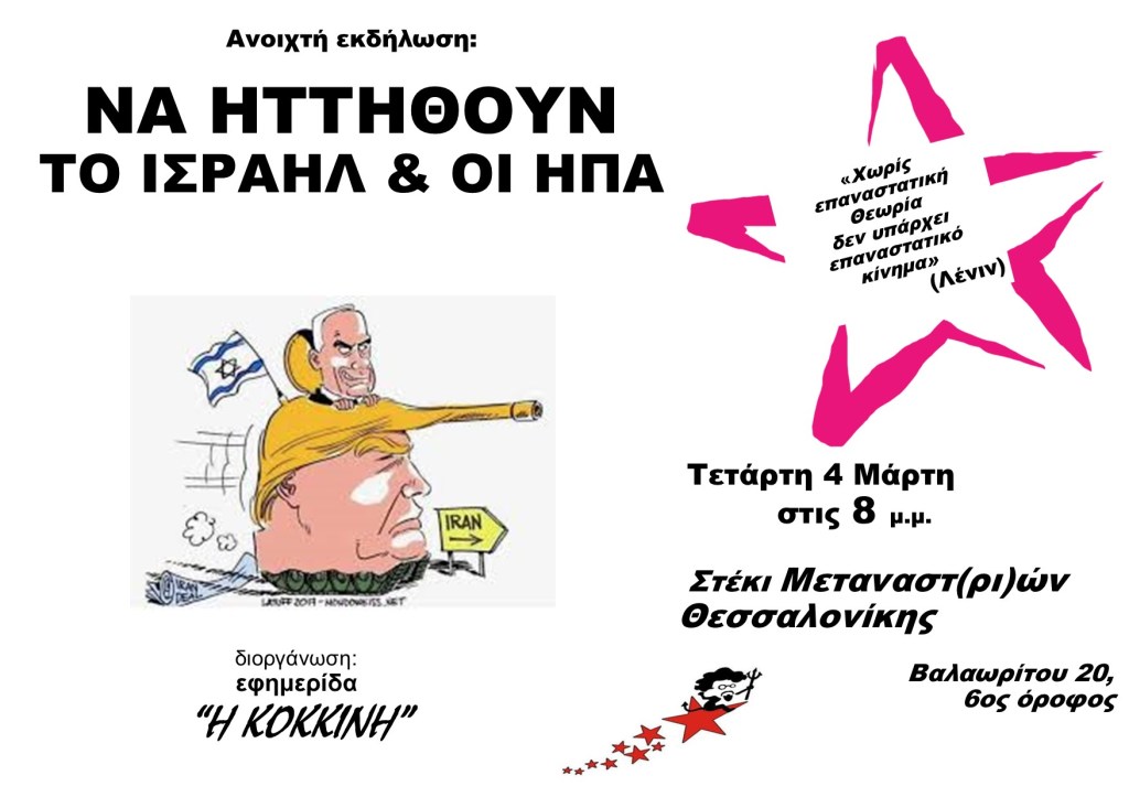 Η ανοιχτή εκδήλωση της «Κόκκινης» θα πραγματοποιηθεί την Τετάρτη 4 Μάρτη στις 8 το απόγευμα στο Στέκι Μεταναστ(ρι)ών Θεσσαλονίκης, Βαλαωρίτου 20 στον 6ο όροφο.